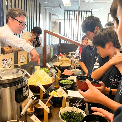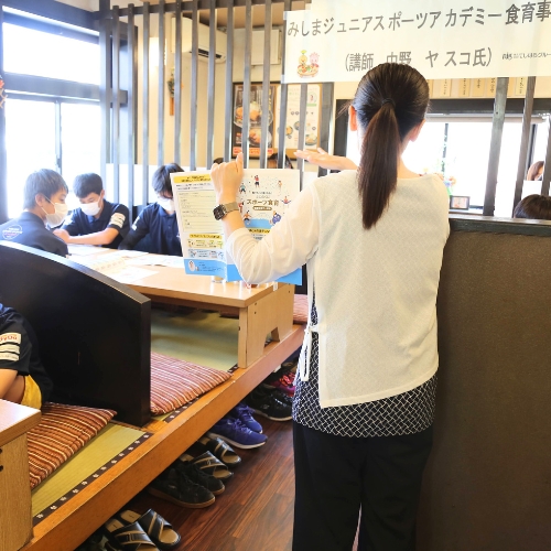 - この栄養講座では、飲食店での実食による体感型のプログラムを実施しております。受講生自身が自分に必要な栄養や食事量を実際にバイキング形式で盛り付け、目で見て、食べて、体感し、理解を深めてもらうことを目的として行います。受講生の保護者も参加しこれからのアスリートの食事の参考としていただきます。